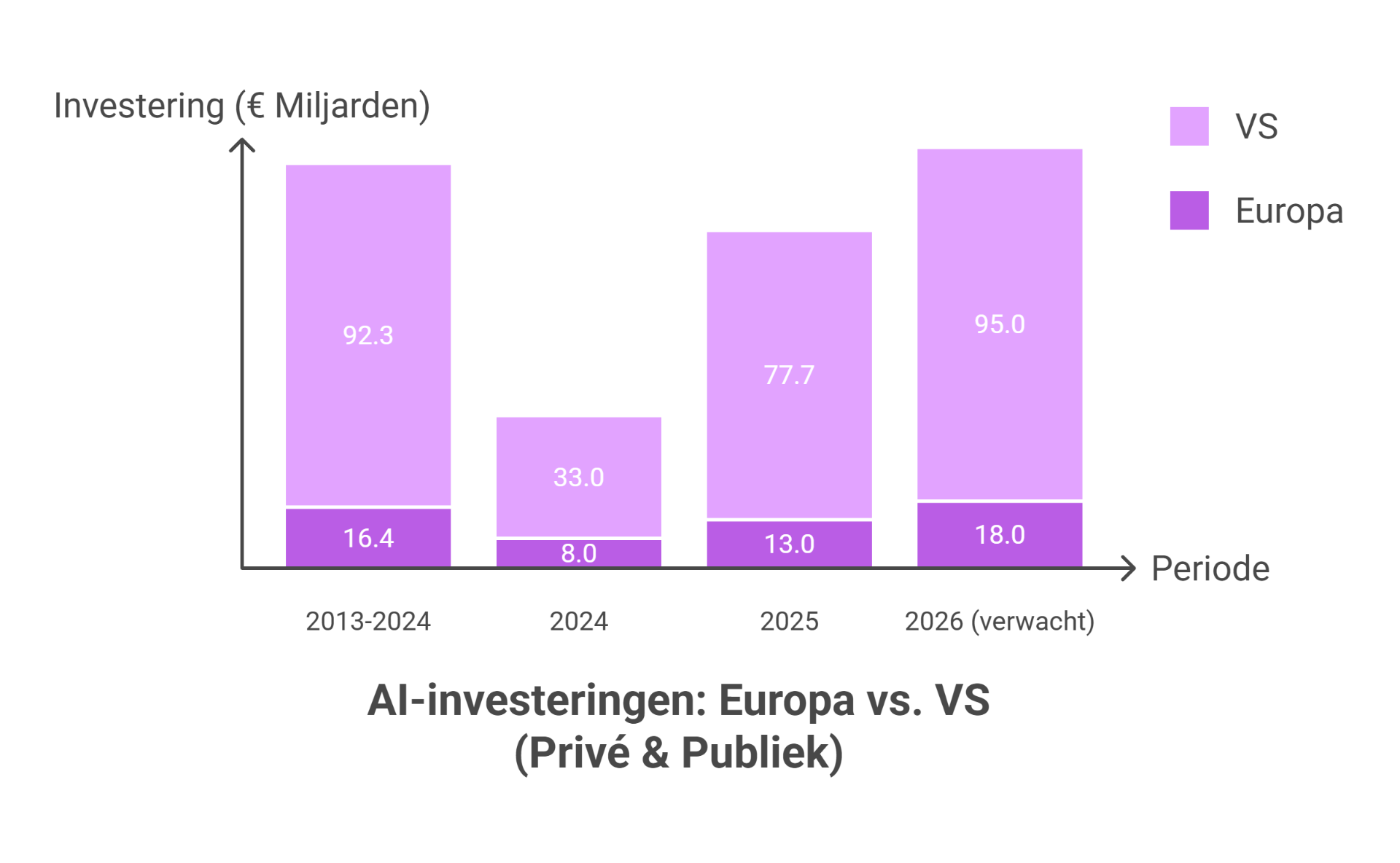 - Europa investeert aanzienlijk, maar het totale volume is nog beperkt. Hierdoor zijn Europese modellen vaak kleiner en minder getraind, hoewel veiligheid en compliance hoger liggen.