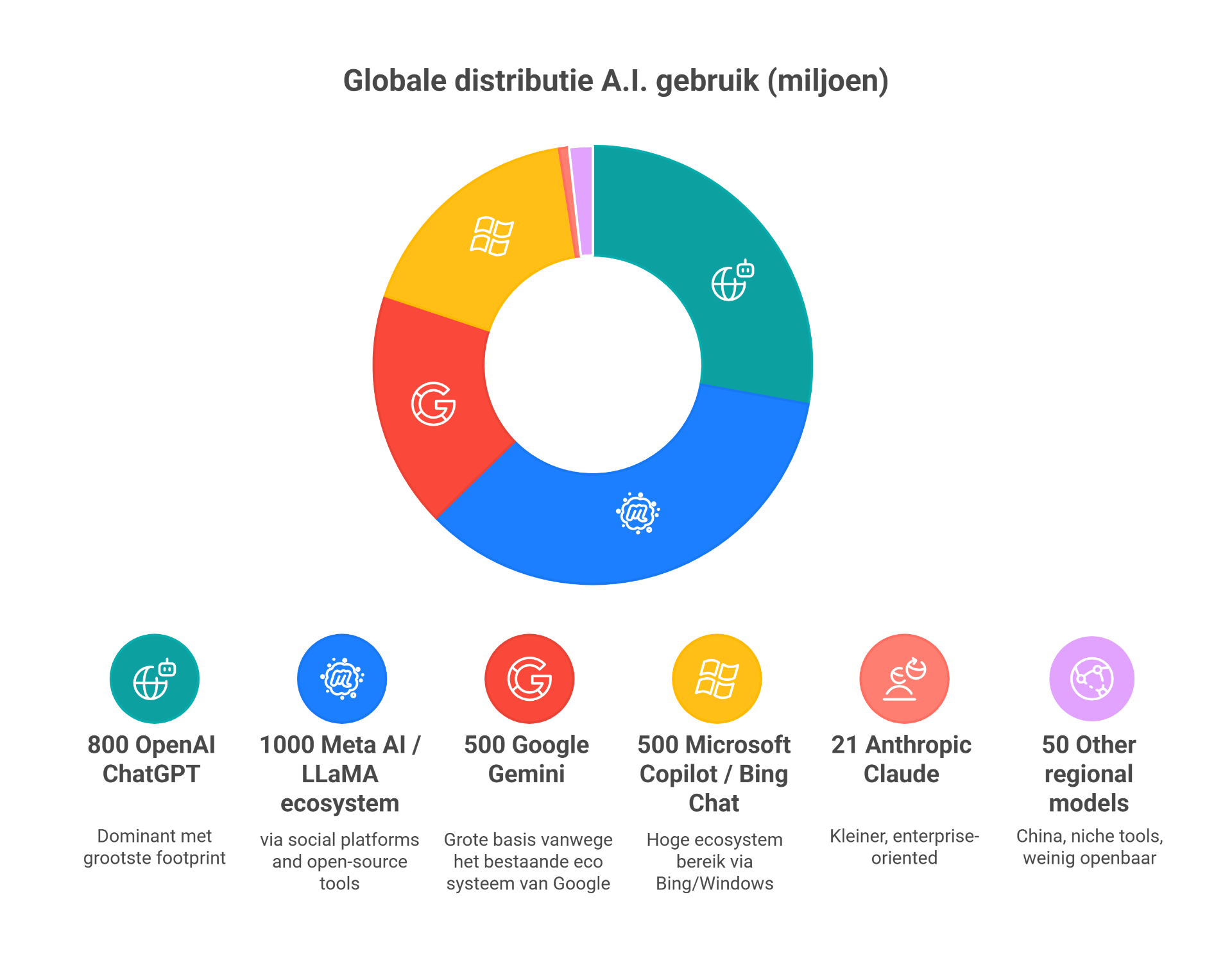 Internationale modellen (voornamelijk uit Amerika) zoals GPT‑4 (OpenAI), Gemini (Google), en Claude (Anthropic) domineren momenteel de markt op gebied van performance en veelzijdigheid. Hun voordelen zijn duidelijk: