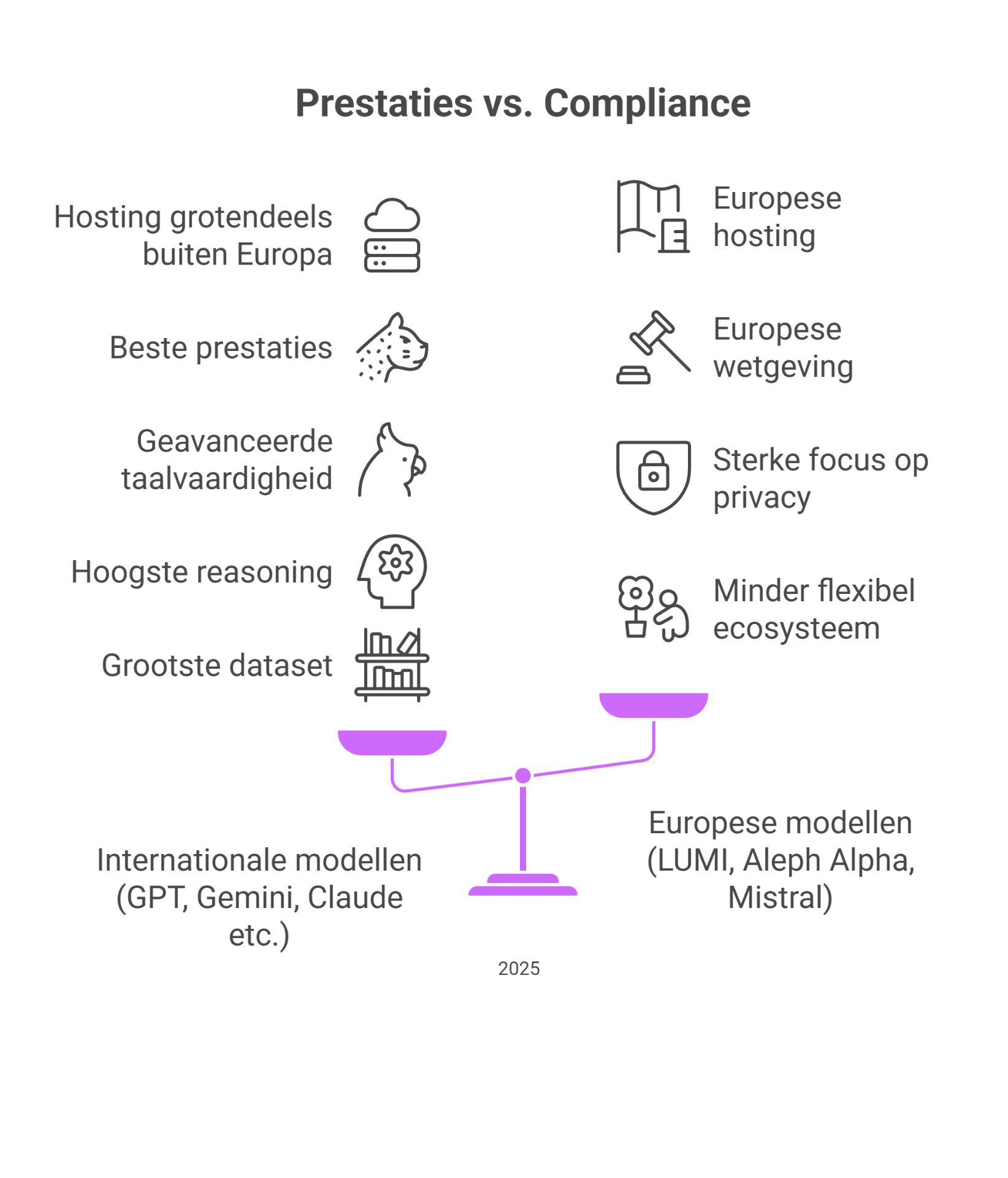Internationale A.I. modellen laten structureel zien dat zij vooroplopen op het gebied van kwaliteit, veelzijdigheid en ontwikkeltempo. Deze voorsprong komt voort uit schaal, investeringskracht en toegang tot enorme hoeveelheden data. Governance, compliance en privacy worden binnen deze ecosystemen steeds minder een randvoorwaarde en steeds meer een ingebouwde standaard, mede gedreven door de eisen van enterprise-klanten en wereldwijde regelgeving.