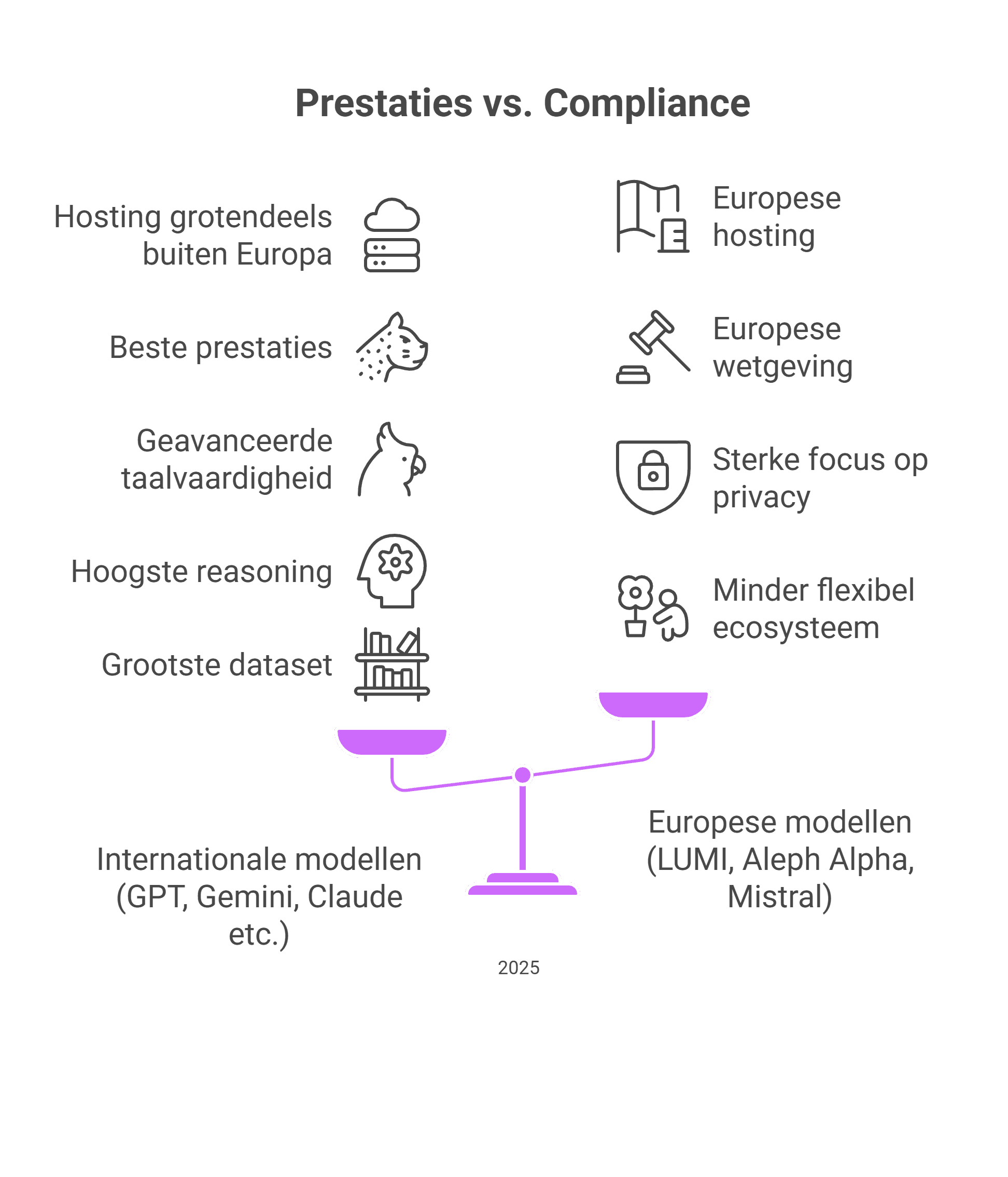 Internationale A.I. modellen laten structureel zien dat zij vooroplopen op het gebied van kwaliteit, veelzijdigheid en ontwikkeltempo. Deze voorsprong komt voort uit schaal, investeringskracht en toegang tot enorme hoeveelheden data. Governance, compliance en privacy worden binnen deze ecosystemen steeds minder een randvoorwaarde en steeds meer een ingebouwde standaard, mede gedreven door de eisen van enterprise-klanten en wereldwijde regelgeving.