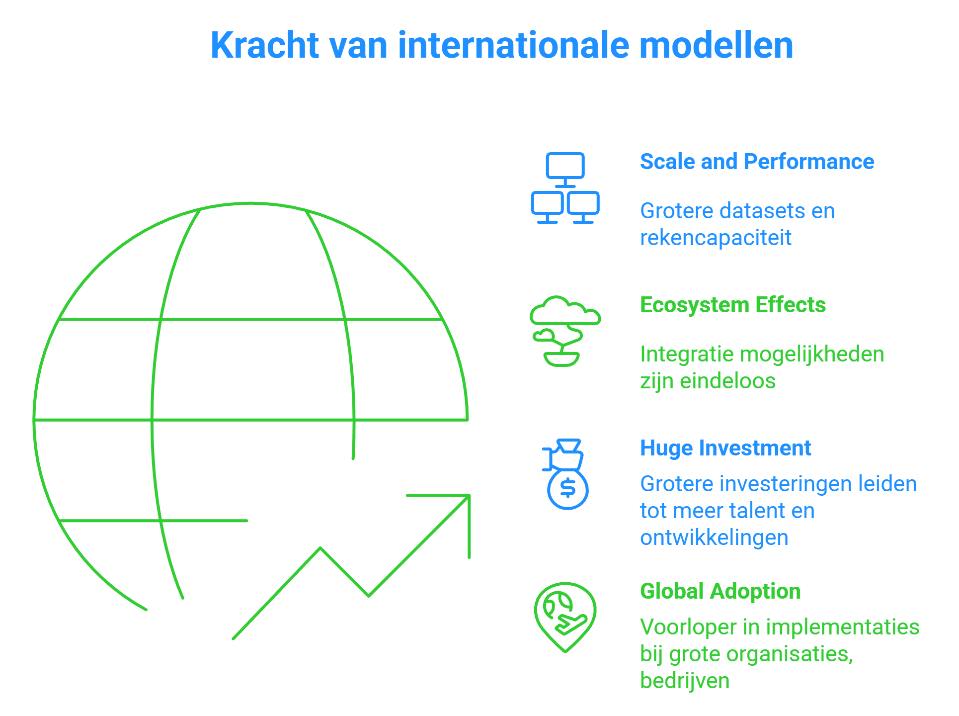 Internationale modellen worden ontwikkeld door bedrijven met miljardenbudgetten. Denk aan OpenAI, Google, Anthropic en Ali Baba. Ze hebben enorme datasets, krachtige servers en miljoenen gebruikers. Ze worden ontworpen met prestatie als uitgangspunt, dat maakt ze bijzonder goed in: