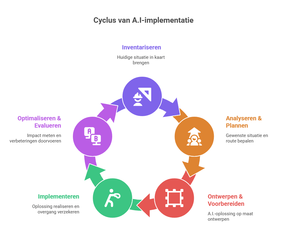 We begeleiden bedrijven stap voor stap, zodat iedereen begrijpt wat er gebeurt en waarom. Zo blijft A.I. niet iets ingewikkelds, maar juist een hulpmiddel dat het werk slimmer en makkelijker maakt.